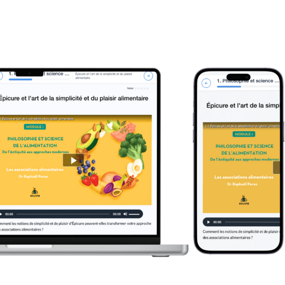 Elle rassemble la masterclass sur la santé intestinale d’Exuvie et la formation approfondie sur les associations alimentaires animée par Raphaël Perez, docteur en pharmacie, afin de vous offrir une compréhension complète et accessible du fonctionnement intestinal.